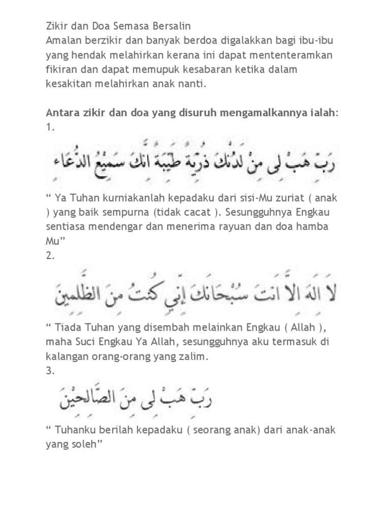 Doa semasa nak bersalin. Doa ini juga sesuai diamalkan semasa bersalin kerana pengorbanan seorang ibu yang bertarung antara hidup dan mati semasa proses kelahiran. Amalkan selalu insyaallah dipermudahkan bersalin dengan kuasa allah swt. Ayat ayat beserta doa doa diatas boleh juga dibaca dan dihembuskan kedalam segelas air untuk diberi minum kepada perempuan yang hendak bersalin semasa mengandung sembilan bulan atau dibaca pada minyak zaitun untuk disapu pada perut dan diminum satu sudu besar setiap hari.